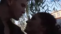 诱惑的金发女郎穿着内衣引诱户外情侣