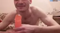 暗棕色男子裸体躯干大幅度伸展进行肛交赤脚男子震动棒行动展示阴茎和肛门